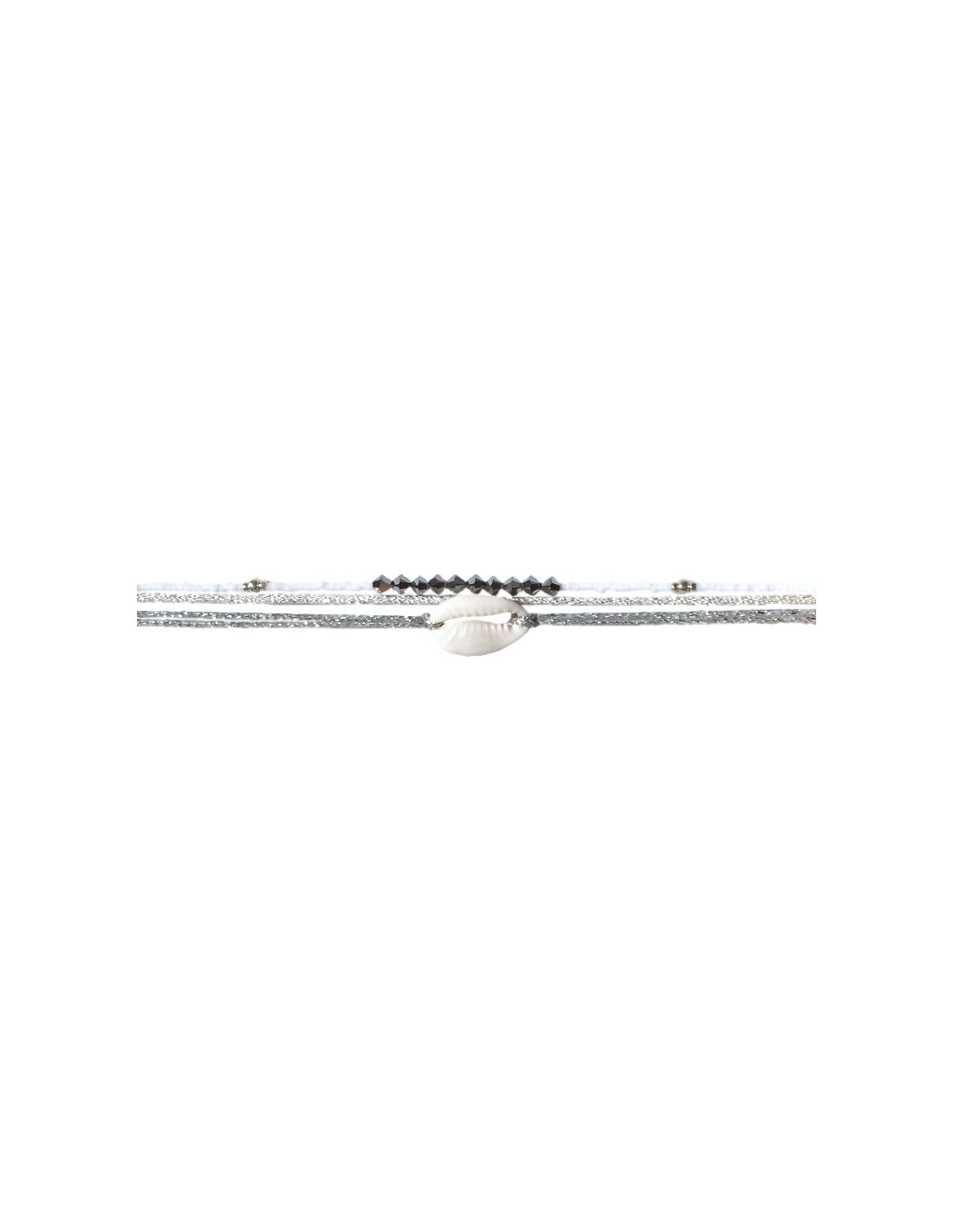 lien composé d'un véritable cauri naturel blanc, de perles Miyuki blanches et argentées, de toupies argentées et d'un cordon Mokuba argenté