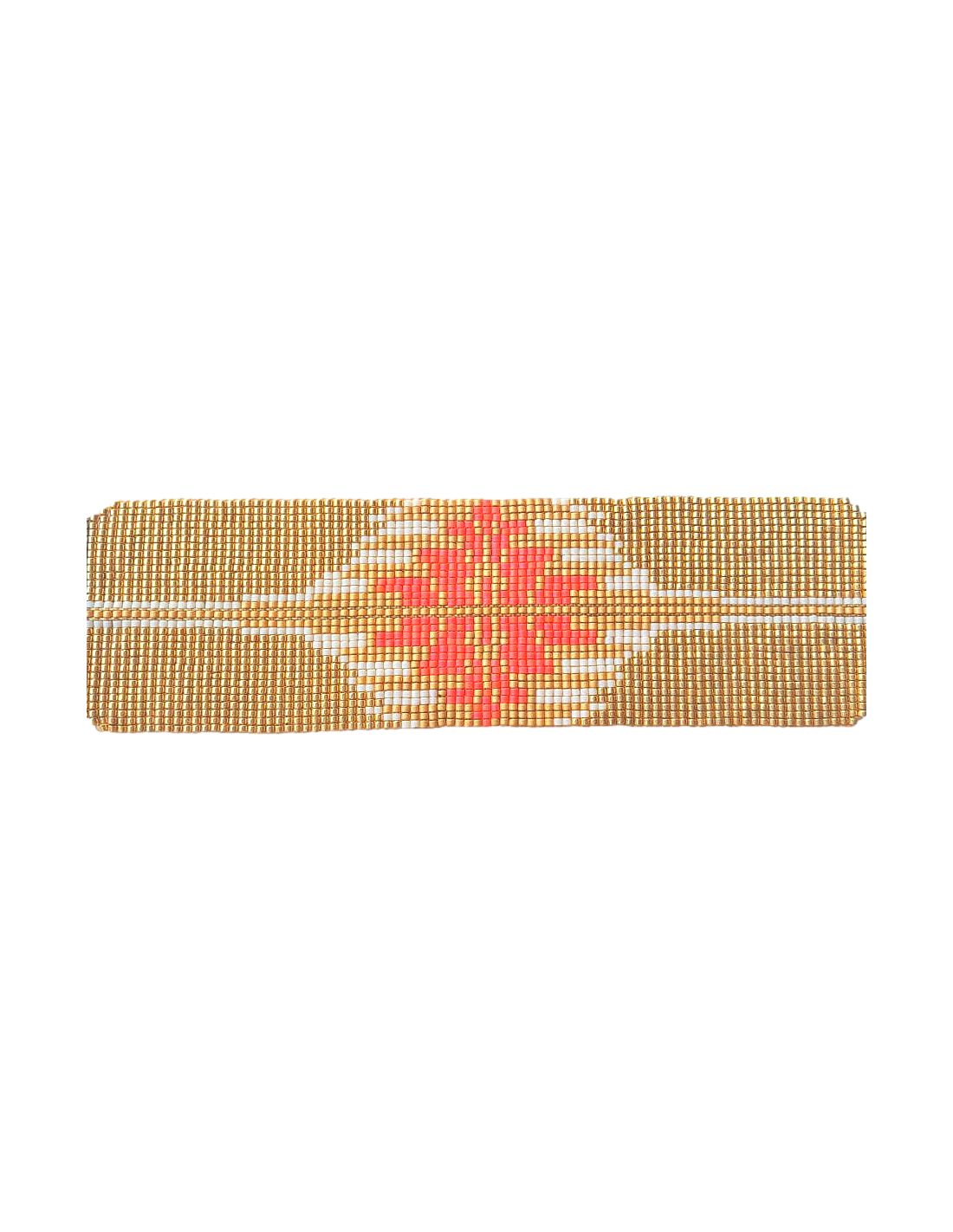Tissage entièrement réalisé à la main au métier à tisser, en perles Miyuki Délica dans les tons doré et corail au design original signé par Hiilos.