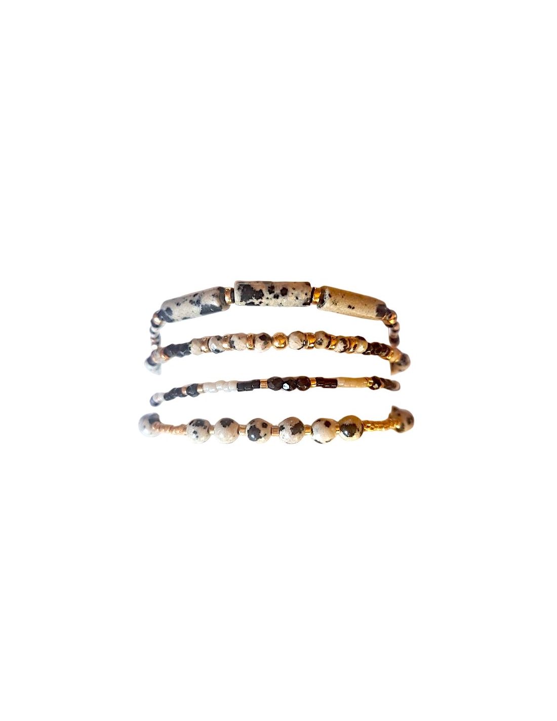 Dalmatian Jasper, paired with black and gold beads, brings joy, lightness and grounding to our day. Each link plays with textures and colors to create a unique, modern and eye-catching piece. Perfect for boosting motivation and confidence while adding an elegant, bold touch to any outfit.